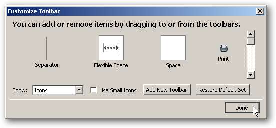Vi behøver faktisk ikke tilføje noget fra dialogboksen tilpasning, bare træk opdaterings-, stop- og startknapperne til deres respektive Firefox 3-placeringer.