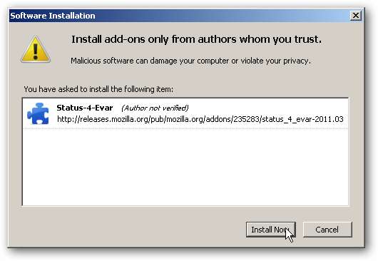 Dette gendanner tilføjelseslinjen, men den opfører sig ikke som Firefox 3. For eksempel viser links, du holder musen over, stadig mål-URL'en i en popup nederst til venstre over statuslinjen. Så for at gendanne Firefox 3-opførsel har vi brug for hjælp fra tilføjelsen Status-4-Evar.
