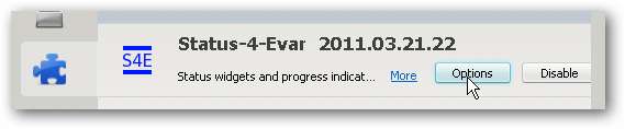 Når du er installeret, skal du konfigurere indstillingerne ved at gå til Værktøjer> Tilføjelsesprogrammer og derefter klikke på det blå puslespil-ikon. Find status-4-Evar-posten, og klik på knappen Indstillinger.