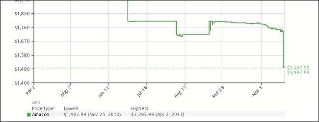 - KamelKamelKamel : CamelCamelCamel fortæller dig ikke kun den aktuelle pris på en vare på Amazon, Newegg og Best Buy, men hvordan prisen har ændret sig over tid. Dette er et vigtigt skridt, fordi detailhandlere har tendens til at lade priserne løbe rundt omkring ferien, så det dræbende salg, de kaster, ser endnu mere lokkende ud (uden at skade deres fortjeneste så meget). Hvis prisen har ramt flere nedture og øget det sidste år, er det vigtigt at vide, om du er i dalen eller stigningen. Du kan gennemgå de faktiske pristabeller selv eller brug de praktiske, gode tilbud / bedste prismærker for at se, om et produkt er til en i øjeblikket stabil pris eller historisk lav. CamelCamelCamel tilbyder prisadvarsler, når varer, du overvåger, oplever et fald i prisen.