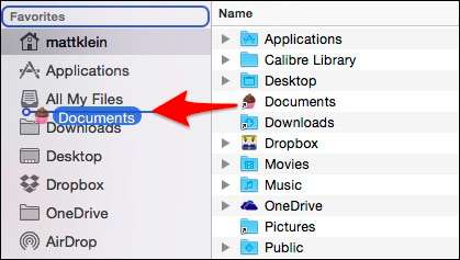 Herfra vil alle applikationer, der bruger OS X's Documents-mappe som en standardlagringsplacering, tro, at de gemmer på den gamle placering i roden af vores brugermappe, når den faktisk gemmes på OneDrive. Genvejen i sidebjælken Foretrukne er også væk, så hvis du vil have den tilbage, skal du trække den nye mappeplacering og oprette en ny favoritgenvej.