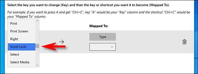 Først skal du vælge den nøgle, du bliver ombind i kolonnen "Til:" ved enten at klikke på knappen "Type" og trykke på tasten på tastaturet eller ved at vælge det fra listen i rullemenuen. For eksempel vælger vi Scroll Lock her, da det ofte sidder ubrugt.