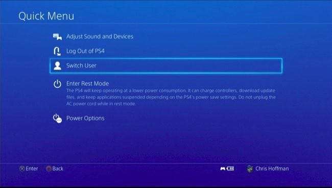 Hvis du har flere brugerkonti på din PS4, skal du logge ind med hver enkelt og indstille en adgangskode for hver profil separat for at begrænse adgangen. Langt tryk på "PlayStation" -knappen på controlleren, og vælg "Skift bruger" for hurtigt at skifte brugerkonti og indstille adgangskoder til hver bruger.