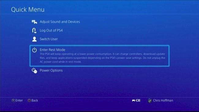 For at logge ud af din PS4 eller sætte den i dvale, når du er færdig, skal du holde "PlayStation" -knappen nede på controlleren og derefter vælge "Log ud af PS4" eller "Gå ind i hviletilstand" i denne menu. Du kan også trykke på tænd / sluk-knappen på selve PS4.