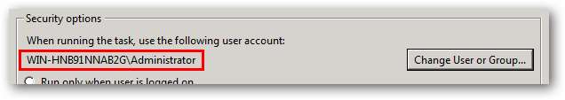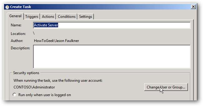 Når du er valgt til import, skal du ændre den konto, som opgaven kører for at være i overensstemmelse med din server. I dialogboksen Opret opgave (som åbnes efter valg af en opgave, der skal importeres), skal du klikke på knappen Skift bruger eller gruppe.