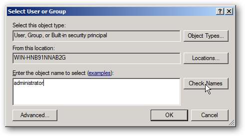 Indtast “administrator”, og klik på Kontroller navne efterfulgt af OK.