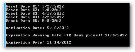 Den mest bemærkelsesværdige ændring, du bliver nødt til at foretage, er at opdatere de respektive datoer for de planlagte opgaver. For at gøre det let har vi inkluderet et værktøj som en del af vores downloadpakke, der beregner de nøjagtige datoer for hver opgave. Kør blot ActivationDates_RunMe.bat fra den udpakkede zip-fil, og du vil se output som eksemplet nedenfor.