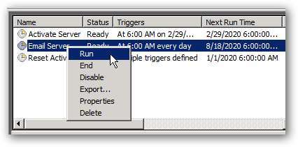 Når du har anvendt dine indstillinger, kan du teste e-mail-opgaven ved at se hovedplanen for planlagt opgave, højreklikke på e-mail-advarselsopgaven og vælge Kør.