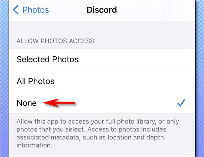 På skærmen Detaljer for appen kan du ændre, om den særlige app, du har valgt, kan få adgang til dine fotos. For at udelukke adgang til dine billeder helt, vælg "Ingen."