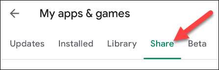 Du bliver bragt til fanen "Opdateringer" på My Apps & Amp; Spil side. Skift til fanen "Del".