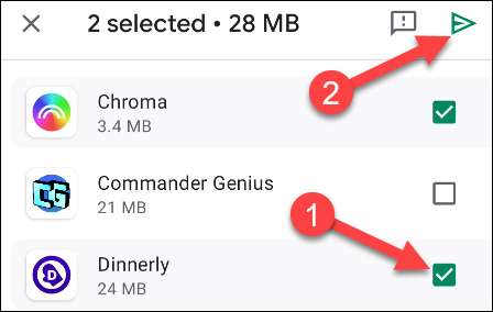 Dernæst vil du se en liste over alle de apps og spil, der er installeret på din enhed. Vælg det, du ønsker at dele, og tryk derefter på Send-ikonet øverst til højre.
