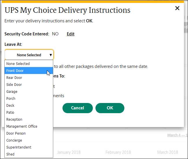 Klik på feltet "Efterlad ved", og vælg et sted, hvor du vil have UPS til at forlade pakken. For eksempel kan du bede dem om at lade det være ved din bagdør, på dit dæk eller med en dørperson eller ledelseskontor på din adresse. Du kan også give en sikkerhedskode, hvis du vil have UPS-leveringsperson til at gå gennem en sikker port eller dør.