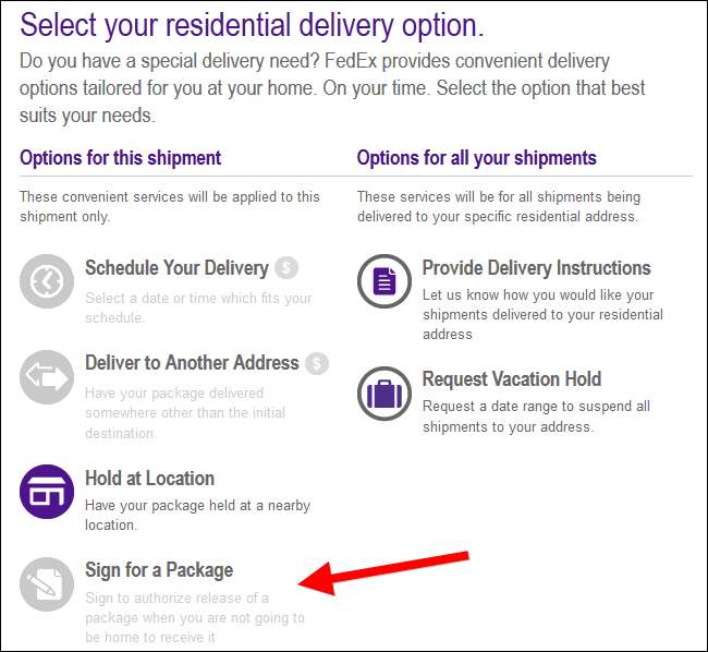 Du behøver ikke at vente derhjemme for at underskrive en pakke - selvom du har en pakke på vej, der kræver en signatur. UPS og FedEx giver dig begge mulighed for at tilmelde dig mange pakker online, og US Postal Service giver dig også mulighed for at godkende leveringer, der muligvis ikke sker, hvis du ikke var der personligt.
