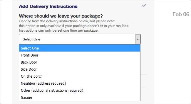 Klik på boksen "Vælg en", og du kan fortælle USPS, hvad du skal gøre med din pakke. For eksempel kan du lade dem efterlade det på din bageste veranda eller aflevere det til en nabo, du angiver til opbevaring. Valgmulighederne inkluderer hoveddør, bagdør, sidedør, på verandaen, nabo (adresse påkrævet), andet (yderligere instruktioner krævet) og garage.