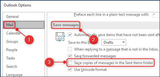 I fanen "Mail" skal du rulle ned til afsnittet "Gem beskeder" og afmarker "Gem kopier af meddelelser i mappen Sendte varer."