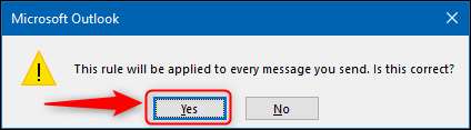 Det næste panel er "hvilken tilstand (er) du vil kontrollere?" Når vi vil have denne regel til at gennemføre alle sendte e-mails, skal du ikke kontrollere nogen betingelser, bare klik på "Næste". Der vises en dialog, der beder dig om at bekræfte, at denne regel vil påvirke alle e-mails, du sender. Klik på "Ja".