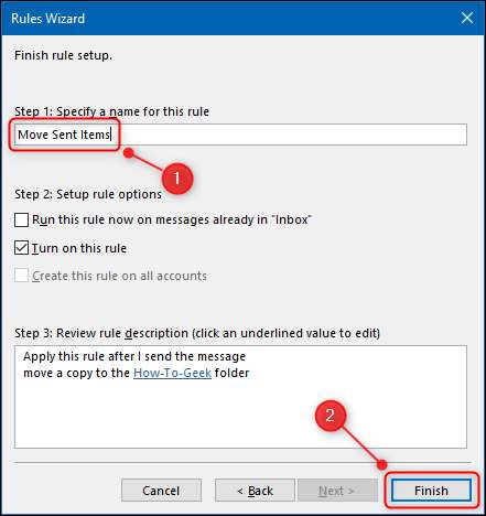 Klik på "Næste" igen, giv din regel et navn på slutskærmen, og vælg derefter "Afslut".