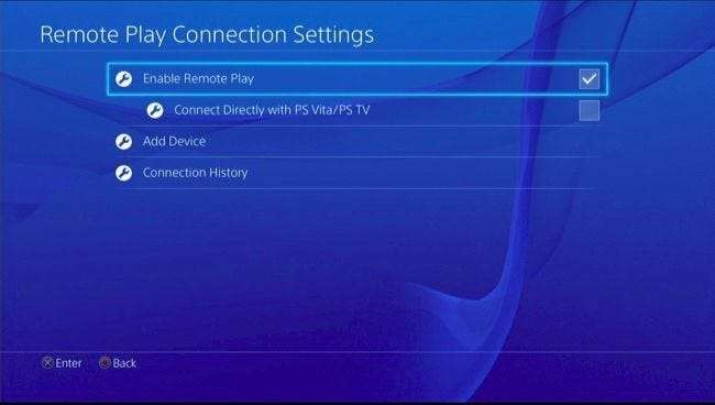 Først skal du aktivere Remote Play på din PlayStation 4, hvis du ikke allerede har gjort det. Gå til din PlayStation 4s indstillingsskærm, vælg "Remote Play Connection Settings" på listen, og aktiver "Enable Remote Play" -indstillingen.