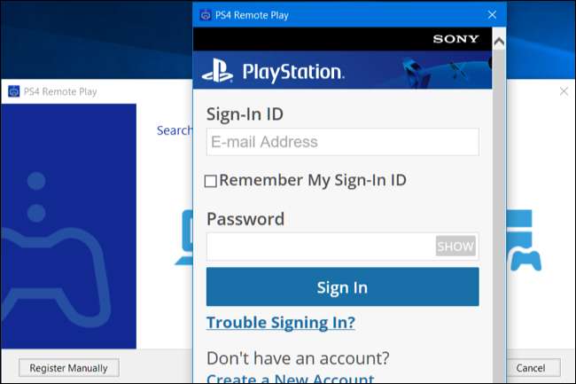 Hvis Remote Play-appen ikke finder din PS4 automatisk, kan du parre Remote Play-applikationen manuelt med en PS4. Klik på knappen "Registrer manuelt" på skærmen, der vises, mens appen prøver at oprette forbindelse. Du bliver derefter nødt til at få en kode ved at gå til skærmbilledet Indstillinger> Remote Play Connection Settings på din PS4 og vælge "Tilføj enhed." Du modtager en kode, du skal indtaste i appen.