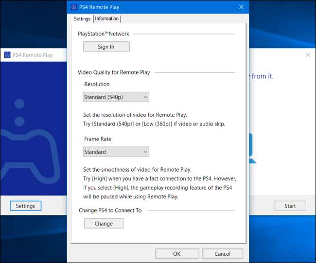 Du kan tilpasse grafiske indstillinger ved at klikke på knappen "Indstillinger" på hovedskærmen. Du kan vælge en opløsning på enten Høj (720p), Standard (540p) eller Lav (360p). Standard er valgt som standard, men du skal prøve at bruge High for den bedste grafiske kvalitet. Hvis videoen eller lyden springer over, kan du sænke denne indstilling for at få streaming til at fungere mere jævnt. Remote Play tilbyder i øjeblikket ikke 1080p som en streamingindstilling.