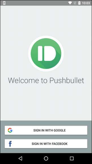 Når du starter det, er det første, du skal gøre, at logge ind, som du kan gøre med enten din Google- eller Facebook-konto. Uanset hvilken du vælger her, skal du bruge det samme login på din computer (når vi kommer til den del).