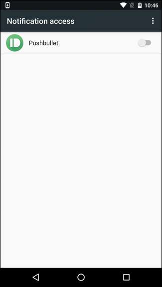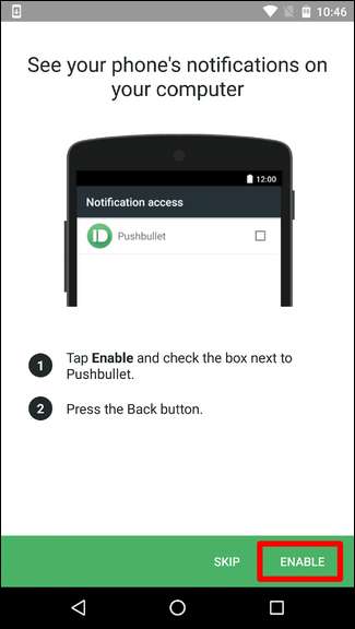 Når du er logget ind, skal du give Pushbullet adgang til dine meddelelser. Klik på "Aktiver" på dette første skærmbillede, som omdirigerer dig til siden Indstillinger for meddelelsesadgang.