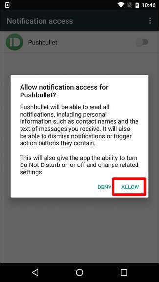 Her skal du gå videre og skub skifte (det kan muligvis være et afkrydsningsfelt i stedet) for at give Pushbullet adgang til alle meddelelser. En advarsel dukker op og fortæller dig, at dette vil give Pushbullet muligheden for at læse alle dine meddelelser. Det er en del af aftalen her, så hvis du vil vise underretninger på din pc, skal du klikke på "Tillad".