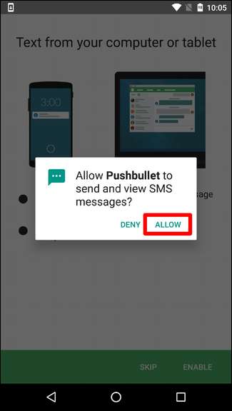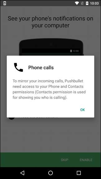 Dette skal smide dig tilbage til Pushbullet-opsætningen, hvor du giver den mulighed for at spejle detaljer om indgående telefonopkald - tryk bare på "OK" og godkend derefter følgende tilladelser (Telefon og kontakter). Færdig.