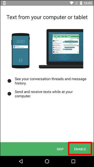 Det næste trin giver dig ikke kun mulighed for at se dine tekstbeskeder, men også svare på dem. Hvis du er interesseret i det, skal du trykke på "Aktivér" og derefter tillade SMS-tilladelsen.