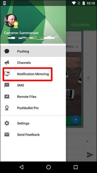 Når du er færdig med den oprindelige opsætning, skal du faktisk aktivere fuld spejling af notifikationer. For at gøre det skal du åbne menuen ved at skubbe ind fra venstre eller trykke på de tre linjer i øverste venstre hjørne. Vælg derfra "Notifikationsspejling" derfra.