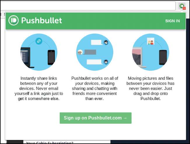 Udvidelsen skal vises som et lille ikon i Chrome's værktøjslinje. Det er en grøn cirkel med en finurlig lille kugle i. Klik på det. Det vil bede dig om at logge ind på Pushbullet.com (som du også kan bruge til at interagere med Pushbullets forskellige muligheder på din telefon). Husk bare at logge ind med den samme konto, som du brugte på din telefon!
