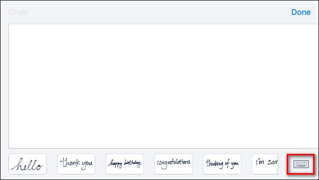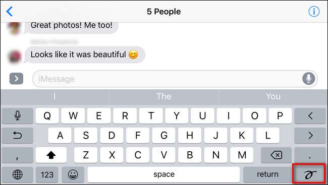 iOS husker denne ændring, og din nye standardgrænseflade til landskabsorientering i iMessage vil være tastaturet i stedet for håndskriftsgrænsefladen (og markeringen fortsætter på tværs af genstart af enheden). Hvis du ønsker at bruge håndskriftsgrænsefladen i fremtiden, skal du bare trykke på håndskriftikonet set på skærmbilledet nedenfor.