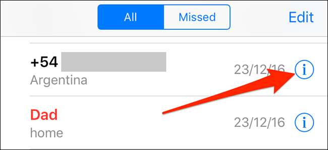 I skærmen "Recents", der åbnes, skal du finde det nummer, du vil fjerne blokering. Derefter, ved siden af det nummer, tryk på ikonet "I".