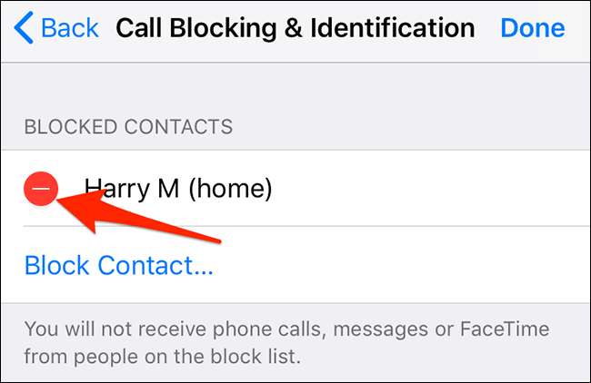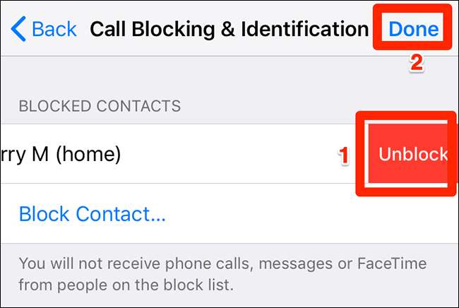 Tryk på "Fjern blokering" ved siden af kontaktens navn, og tryk derefter på "DONE" i øverste højre hjørne.