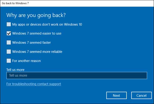 Windows vil først spørge dig, hvorfor du vil gå tilbage. Vælg bare noget, og klik derefter på knappen "Næste".