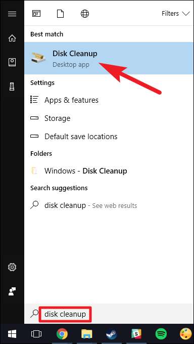 Det tager naturligvis meget plads at gemme hver enkelt fil fra din gamle Windows-installation. Hvis du åbner programmet Diskoprydning , vil du se, hvor meget plads det bruger. Hit Start, skriv "Diskoprydning" i søgefeltet, og klik derefter på resultatet for at køre det.