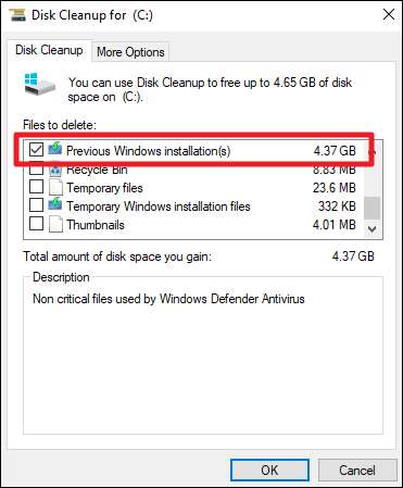 På listen over filer, som Diskoprydning kan fjerne, find posten "Tidligere Windows-installation (er)" og kan se, hvor meget plads det bruger på din harddisk. Hvis du er sikker på, at du ikke vil gå tilbage til din tidligere version af Windows, skal du bruge værktøjet Diskoprydning til at fjerne disse filer og straks frigøre plads.