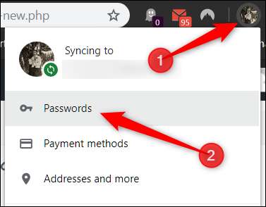 Først skal du sørge for, at adgangskodebesparelse er aktiveret (den skal være aktiveret som standard). For at kontrollere skal du klikke på dit profilbillede i øverste højre hjørne og derefter klikke på "Adgangskoder". Du kan også skrive