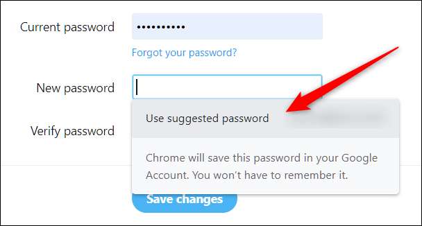 Log ind på kontoen med den adgangskode, du vil ændre, og gå til det afsnit, hvor du kan ændre / nulstille din adgangskode. Når du har klikket i feltet "Ny adgangskode", skal der vises en prompt med et stærkt forslag om adgangskode. Klik på "Brug foreslået adgangskode."