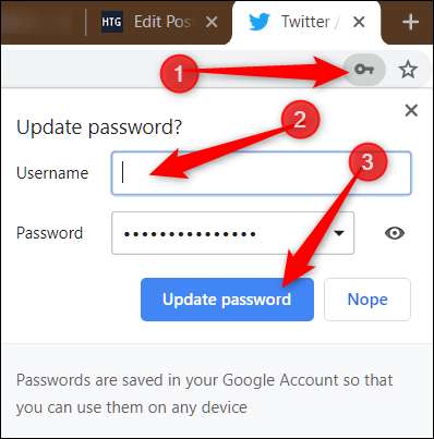 En advarsel ved at bruge denne funktion til at ændre adgangskoden til en eksisterende konto er, at den muligvis ikke automatisk opdaterer den i Chrome, i hvilket tilfælde skal du gøre det manuelt. Dette er dog ikke svært. Efter at have gemt den nye adgangskode, inden du forlader webstedet, skal du klikke på nøgleikonet i omnifeltet, indtaste brugernavnet for dette websted og derefter klikke på "Opdater adgangskode."