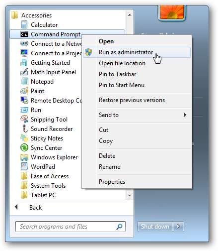 Alternativt, hvis du har gjort det deaktiveret søgefeltet , kan du finde kommandoprompten i Alle programmer> Tilbehør.
