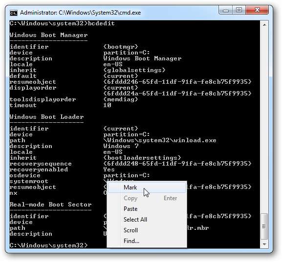 Højreklik et eller andet sted i kommandopromptvinduet, og vælg Mærke .