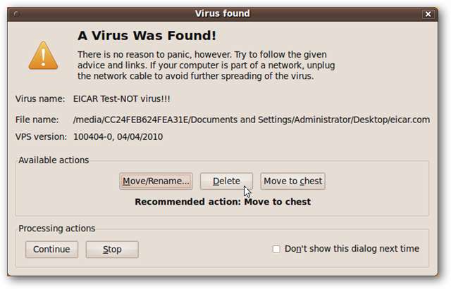 Hvis der findes en virus, bliver du bedt om at vælge en handling. Hvis du ved, at filen er en virus, kan du slette den, men der er mulighed for falske positive, så du kan også vælge Flyt til bryst for at sætte den i karantæne.