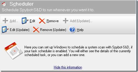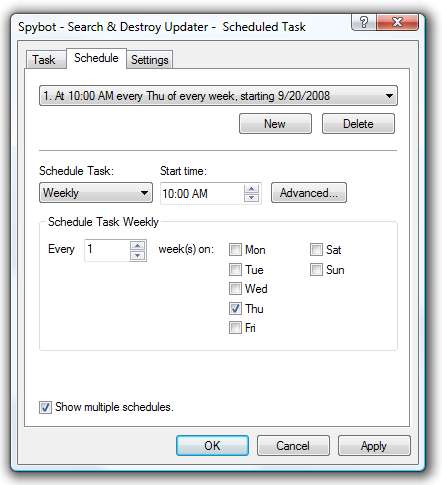 Spybot lancerer planlagte opgaver, som er en Windows-komponent. Det betyder ikke noget, hvilken du starter med, men her redigerer vi Updater først. Så klik bare på Rediger (Opdater), fanen Planlæg og den nye knap. Dette giver dig mulighed for at indstille en dato, et klokkeslæt og en frekvens for at kontrollere databaseopdateringer.