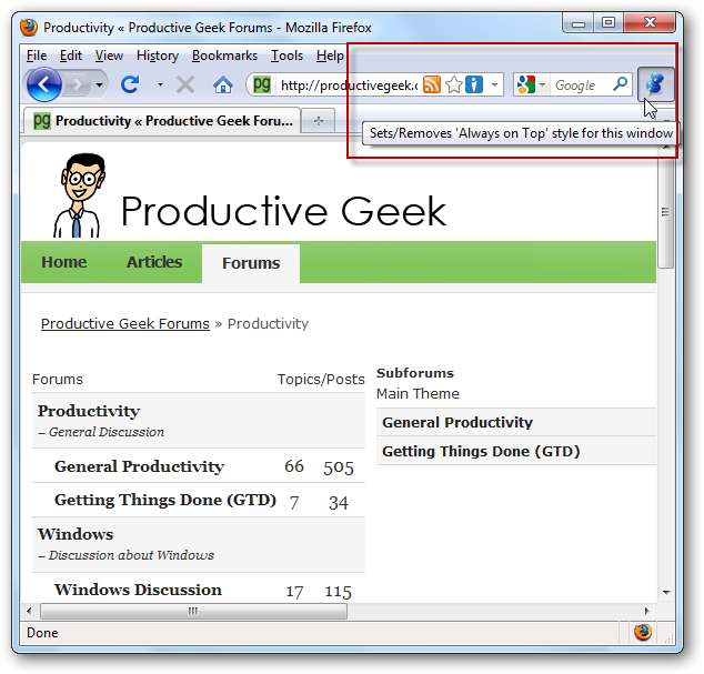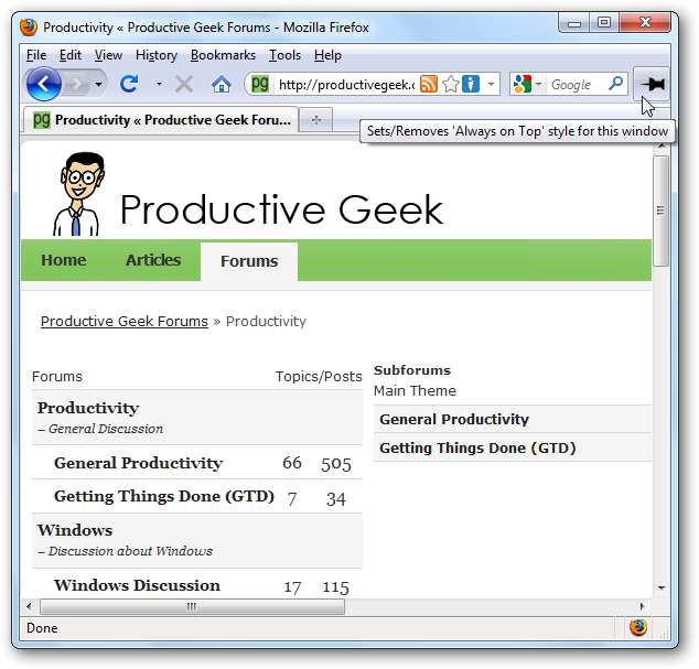 Udvidelsen Always on Top blev lavet til kun at gøre en ting, og det gør det meget godt ... holder dit Firefox-vindue øverst. At være i stand til at tænde eller slukke for det uden at grave gennem en masse menuer tilføjer det ekstra niveau af bekvemmelighed.
