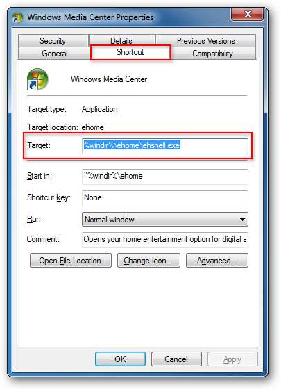Vi tilføjer alle disse kontakter til slutningen af Mål på fanen Genvej i egenskaberne af Windows Media Center. Hvis du starter Media Center fra menuen Start, skal du gå til Start > Alle programmer, højreklik på Windows Media Center og vælg "Egenskaber". Hvis du starter Media Center fra en genvej på skrivebordet, skal du blot højreklikke på ikonet og vælge "Egenskaber". På fanen "Genvej" vil du se Mål felt med tekststrengen: % windir% \ ehome \ ehshell.exe.