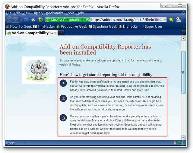 Så snart du installerer Add-on Compatibility Reporter, får du en informationsside om, hvordan udvidelsen fungerer, og hvad du kan gøre med den. Du bør bestemt tage et øjeblik at læse dette, da det er meget nyttigt.