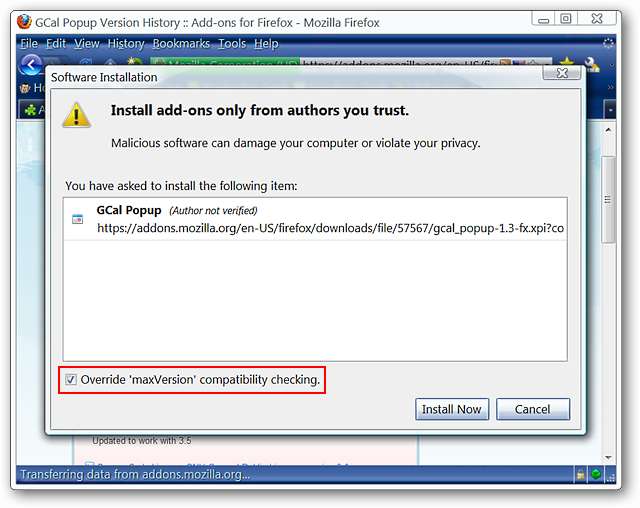 Efter at have prøvet vores ikke-kompatible udvidelse igen, kunne vi fortsætte med installationsprocessen. Bemærk nederst, at "kompatibilitetskontrol" er blevet tilsidesat.