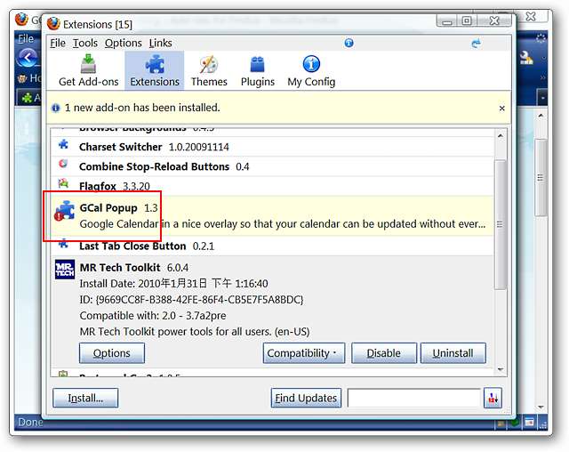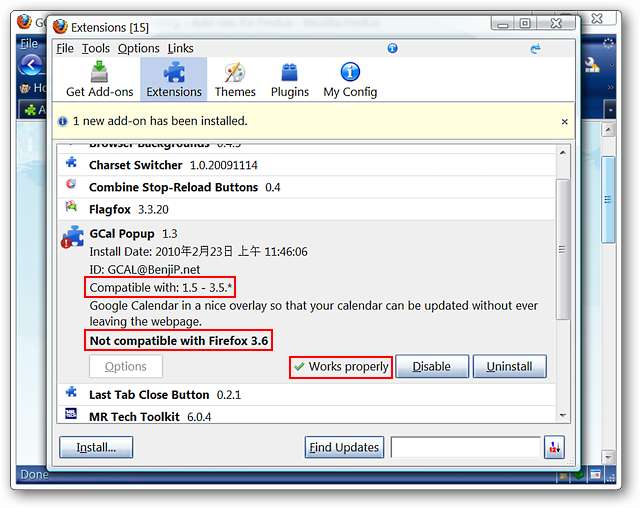 Så snart vi genstartede vores browser, var det let at se "ikke-kompatibelt ikon" i "Add-ons Manager-vinduet" ... men udvidelsen installerede dog ( fantastisk! ).