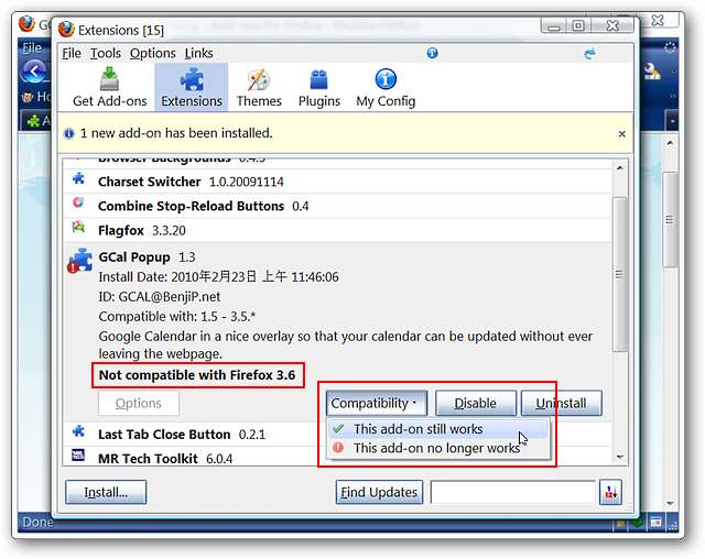 Ved at klikke på udvidelsens post vises en ny knap i nederste højre hjørne. Ved hjælp af "Kompatibilitetsmenuen" kan du rapportere, om udvidelsen fungerer så godt som før, eller hvis den faktisk har problemer. Udvidelsen, som vi brugte til vores eksempel, havde ingen problemer overhovedet så gode nyheder der.